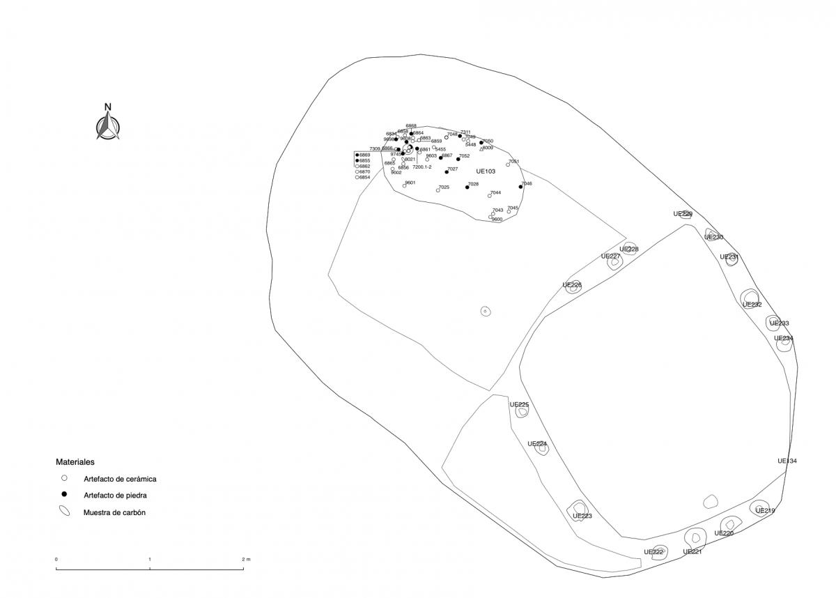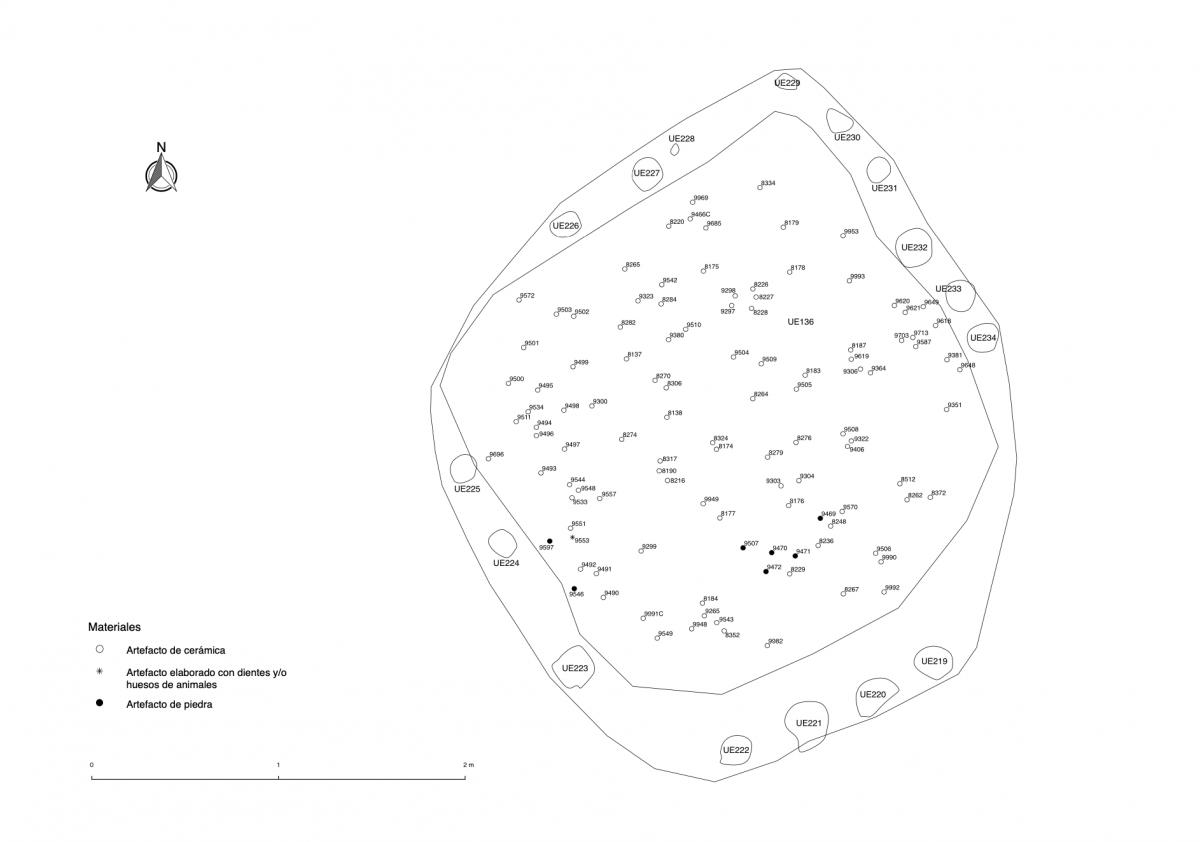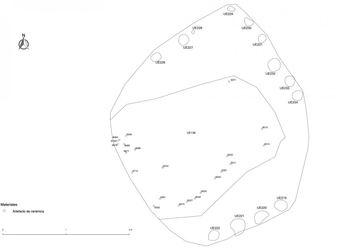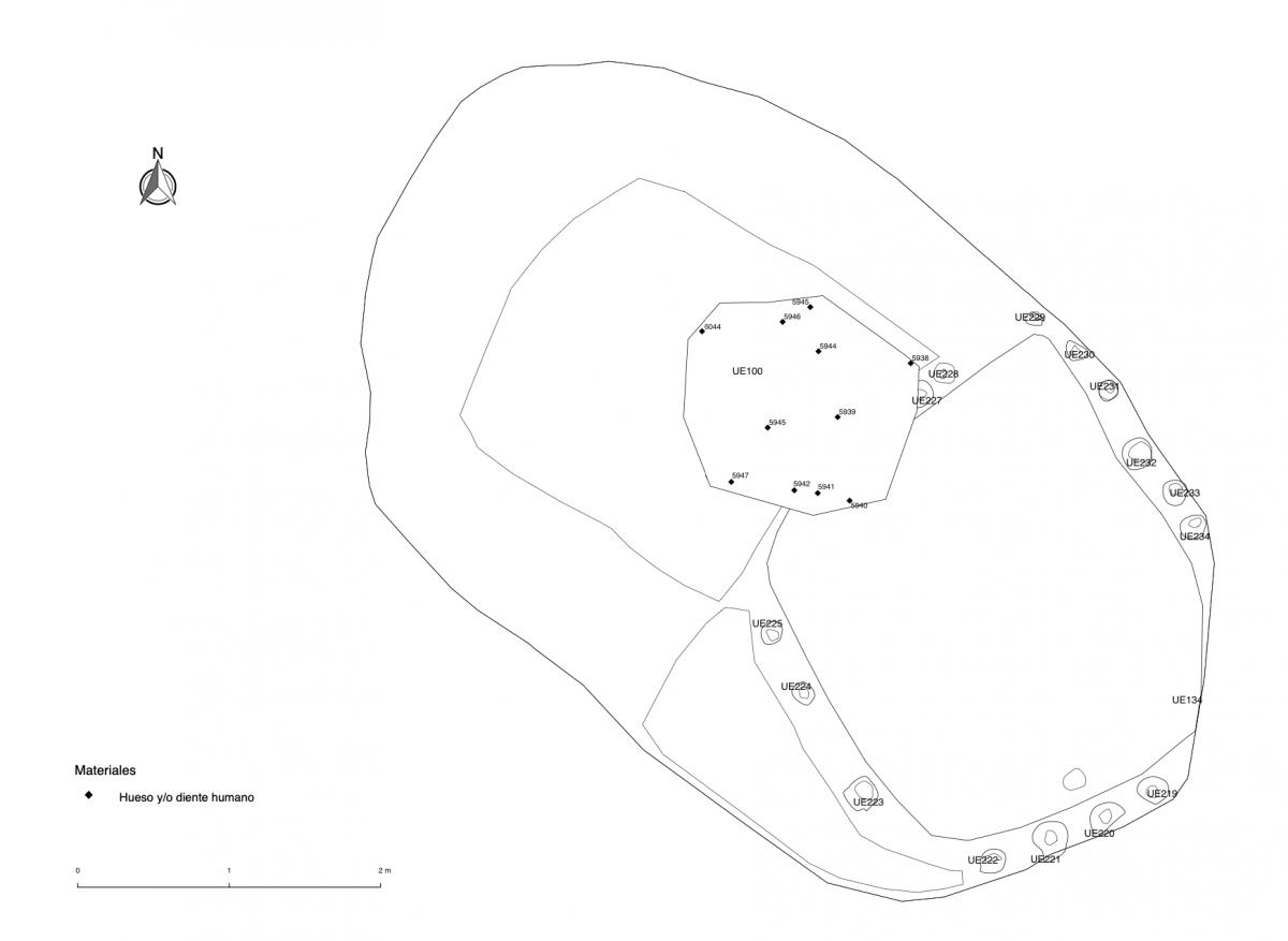 Información del recurso:  Primer nivel de entierro de la tumba T2. Consiste en el entierro de 5 individuos colocados en un plataforma en forma de "U" situada en la parte alta de la fosa de la tumba. Los cuerpos se colocaron en decúbito central extendido. Fueron parcialmente cubiertos con cerámicas. La plataforma apareció muy deformada en su lado norte.
