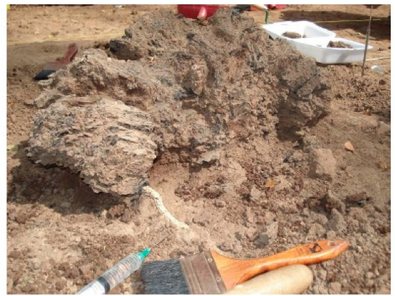 381 - T6-UE125 (a , (llamado en el año 2013, unidad UE167).Entierro de la tumba T6. Depósito de huesos humanos en posición primaria localizado a 3,48 m de profundidad. Es un entierro múltiple...