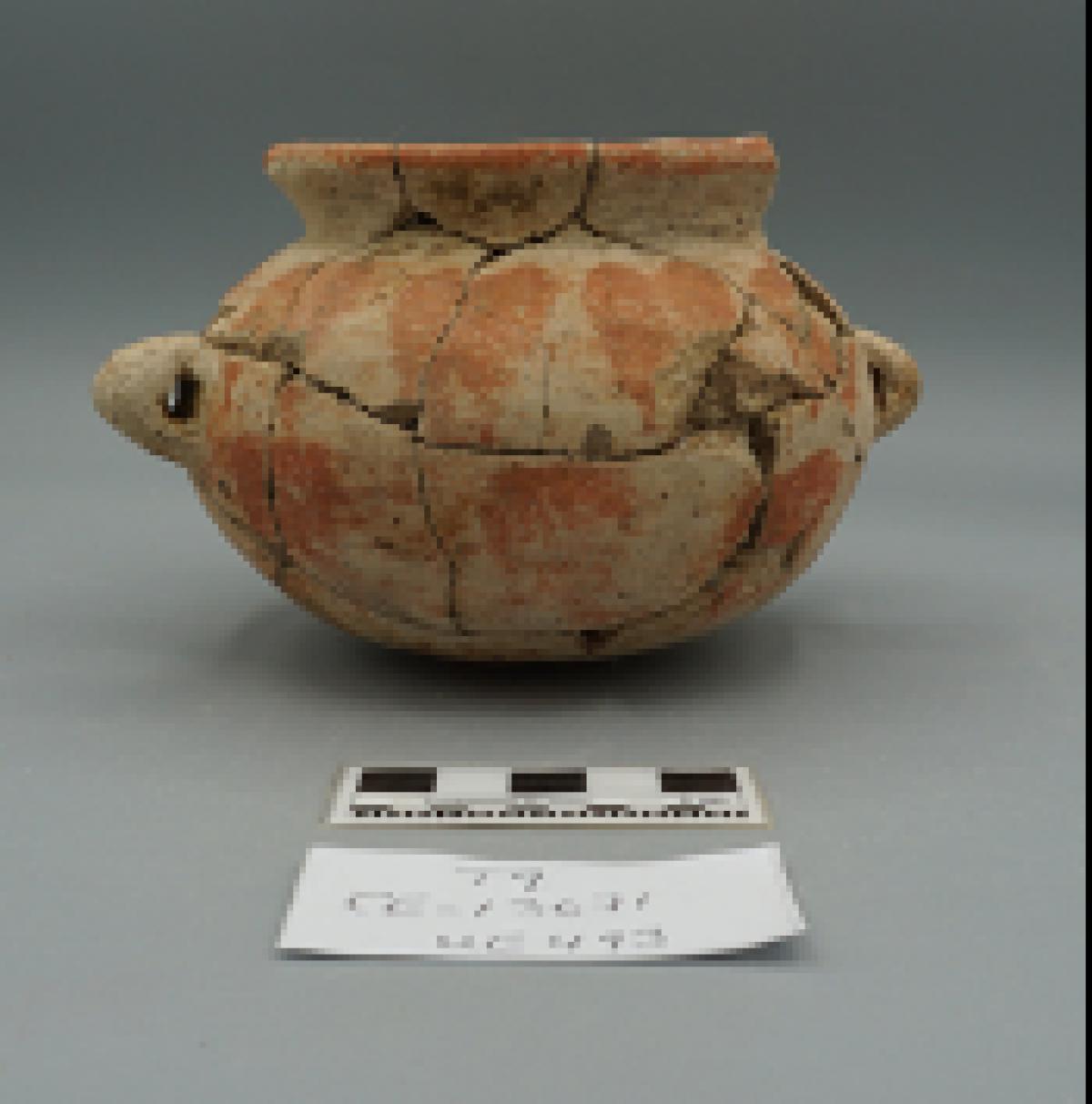 3619 - Olla globular de línea roja, sin soporte y con asa en el cuerpo.