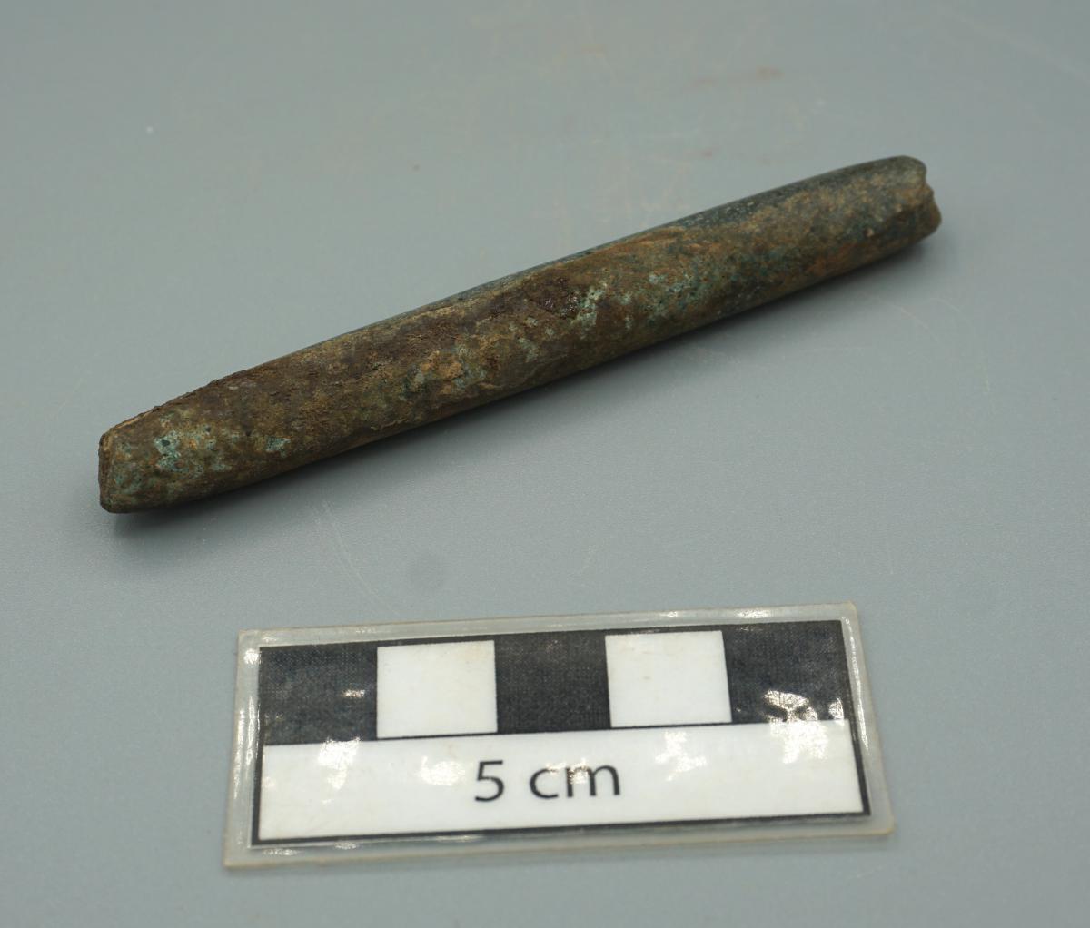 397 - Punzón-cuchilla. Se trata de un artefacto metálico de forma alargada. En un extremo es apuntada y en el opuesto presenta un filo cortante liso. Está muy oxidado.