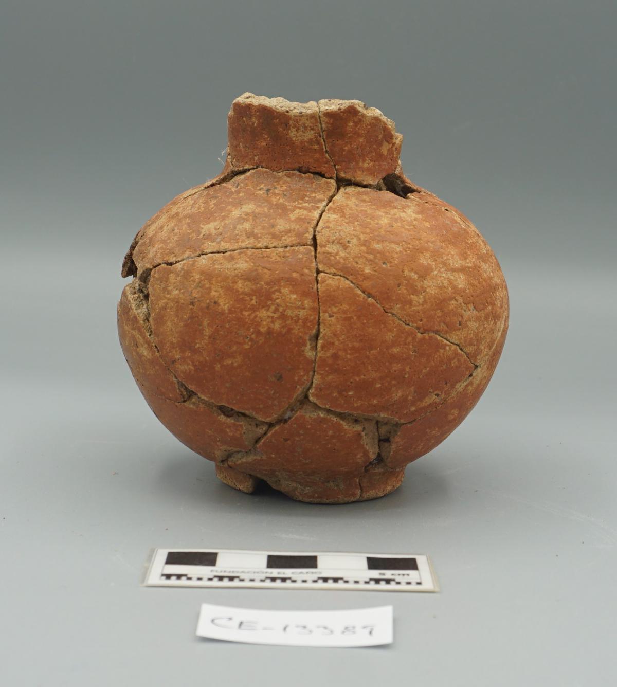 3632 - “Jarra globular de pasta roja plena, con base anular, borde recto y cuello corto