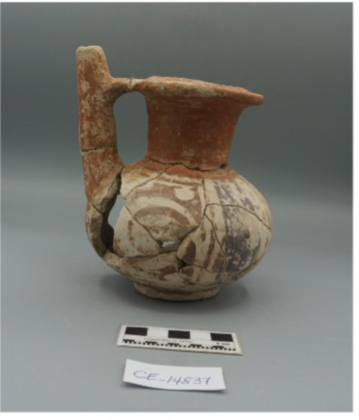 396 - Jarra polícroma globular de cuello largo. Decoración geométrica de espiral continua "yc" a modo de friso sobre el cuello y a modo de bandas alternas de color en zigzag sobre el cuerpo.