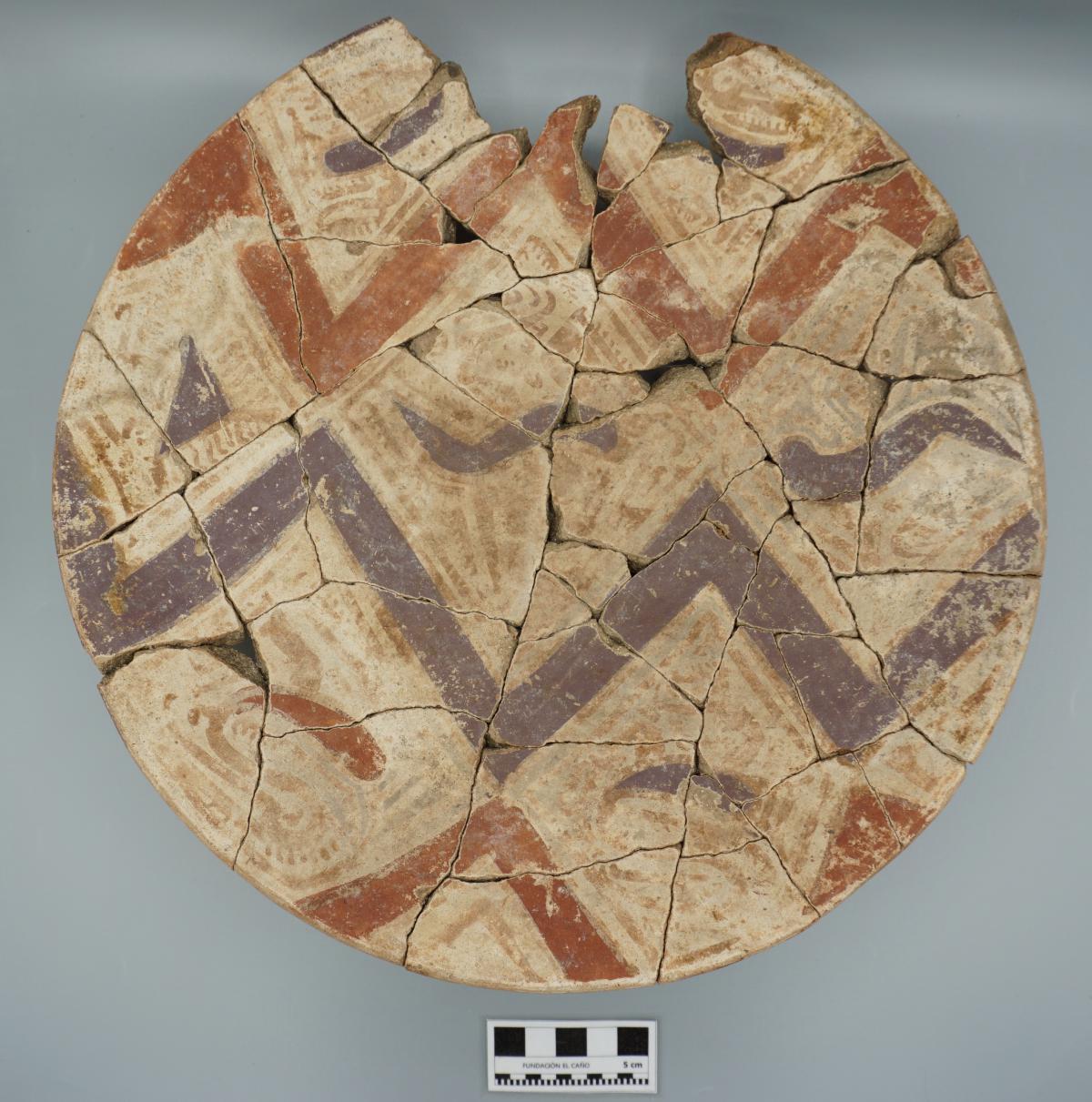 385 - Plato polícromo de borde engrosado exterior. Doble engobe (blanco en el anverso y rojo en el reverso) y decoración en bandas de color alternas zigzagueantes (rojo y morado).