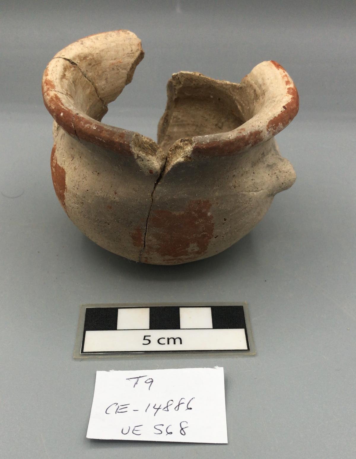 3566 - Jarra globular de base anular, cuello corto y borde plano. Engobe rojo en la superficie exterior.