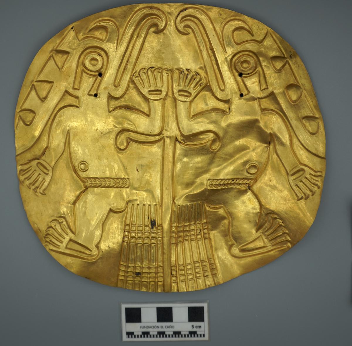 Información del recurso:  Vista del anverso del pectoral AU15419. Es un pectoral discoidal de oro martillado y pulido, repujado con las figuras de dos aves antropomorfas. La escena se organiza a partir de un eje vertical de simetría especular que remarca la dualidad de la imagen.