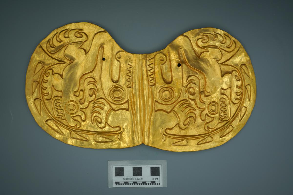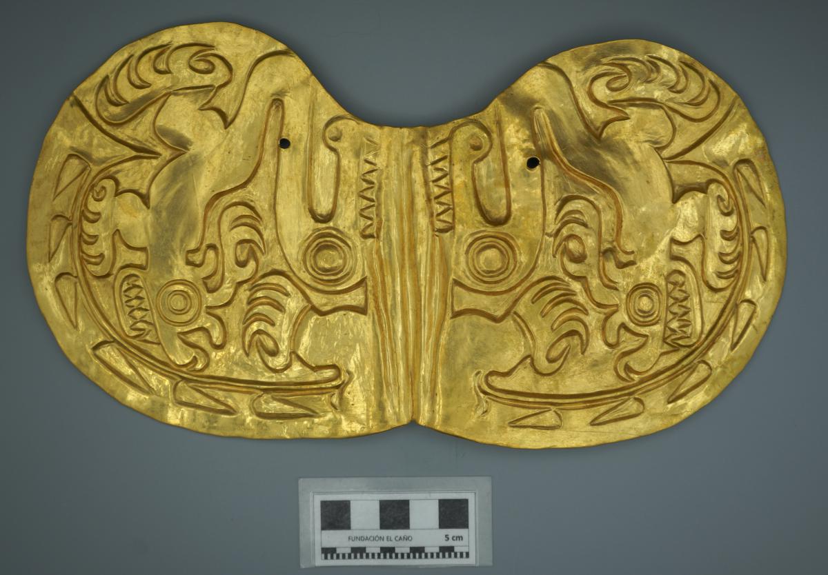 389 - Pectoral discoidal de oro repujado con la representación de un ser sobrenatural híbrido de calamar y ave. Grupo metalúrgico Conte.