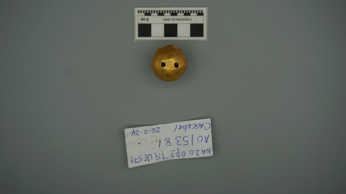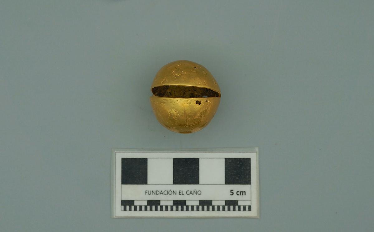 Cascabel esférico de oro fundido con dos orificios de inserción de una cuerda o cordón.