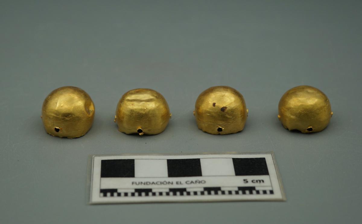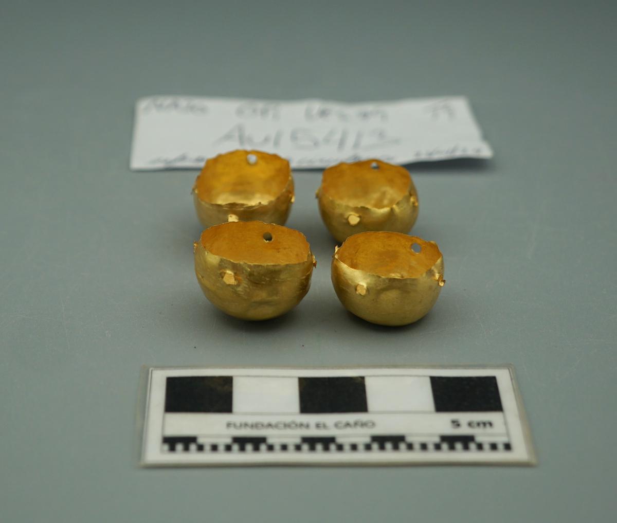 387 - Pectoral de oro martillado repujado con la representación frontal del rostro de un ser sobrenatural con rasgos de un anciano que formaba parte del ajuar del Individuo 20, un infante, de la ...
