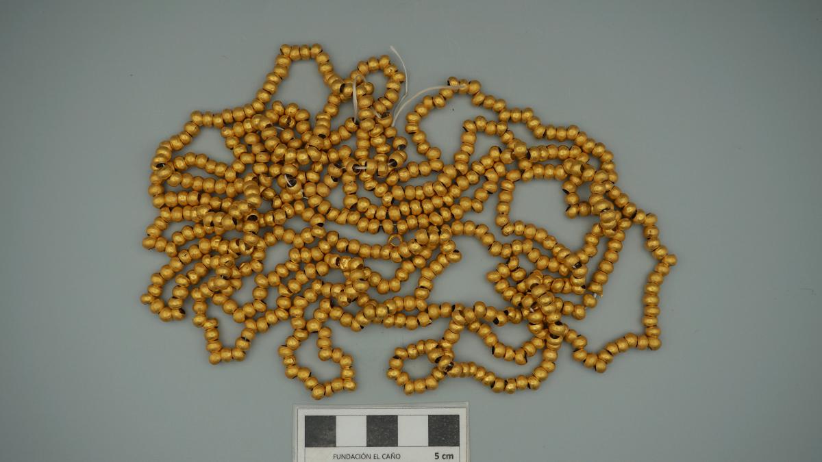 454 - Pulsera compuesta por 39 cascabeles de oro fundido que tienen un espesor alrededor de 2 mm oscilando sus tamaños entre 9 y 13 mm de diámetro y 11 a 16 mm de largo. El objeto formaba parte ...