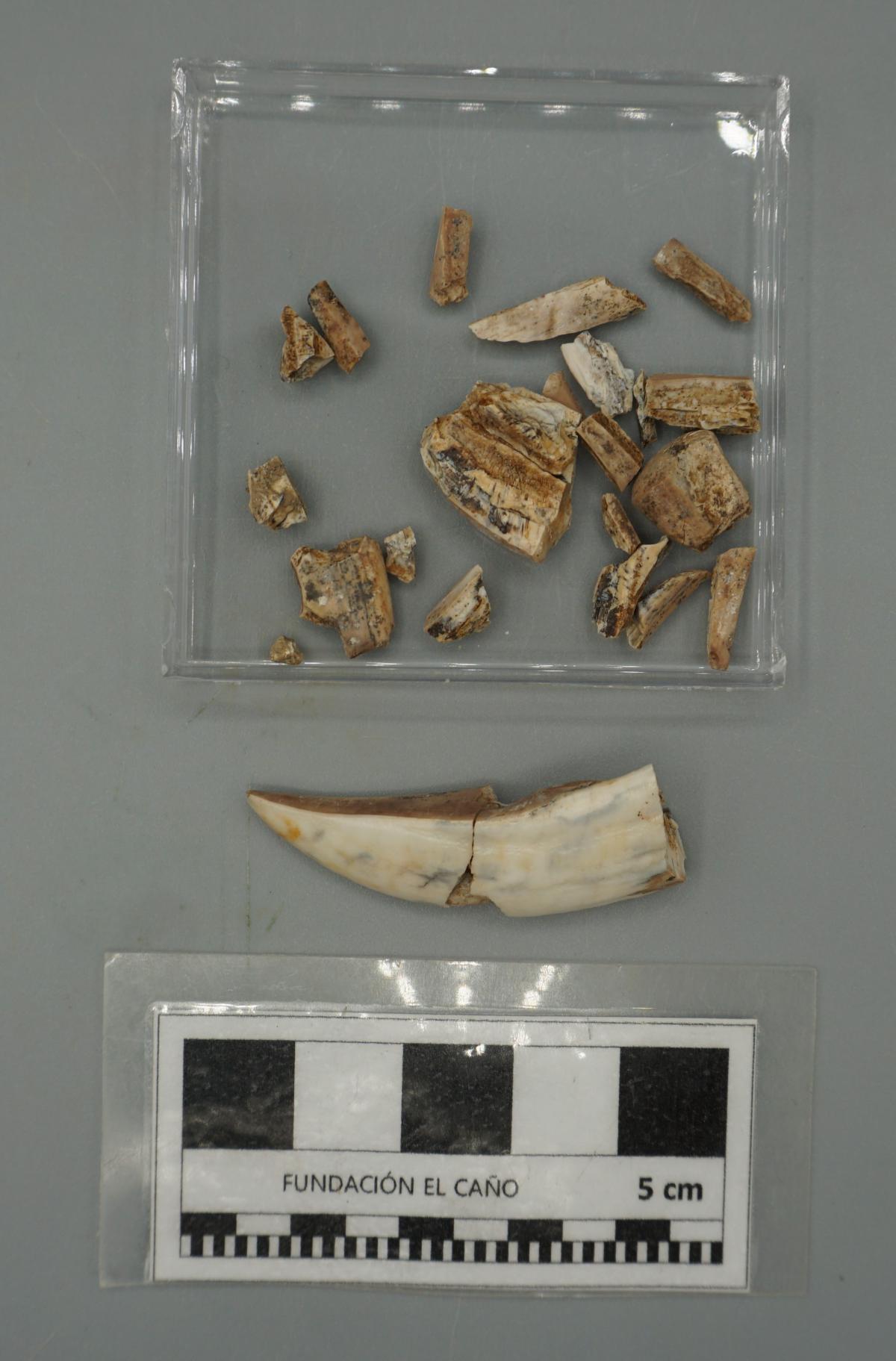 3592 - Canino de perro perforado. Aunque se encuentra fragmentado, se conservan sus partes.