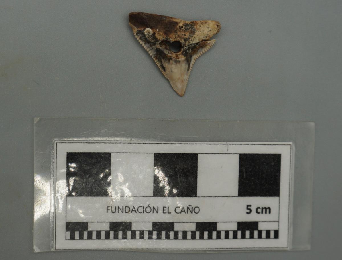3571 - Diente perforado de tiburón. La perforación indica que pudo haber formado parte de un artefacto ornamental.