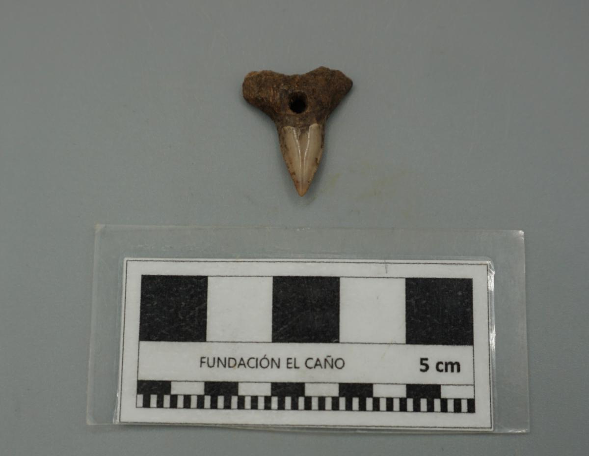 3571 - Diente perforado de tiburón. La perforación indica que pudo haber formado parte de un artefacto ornamental.