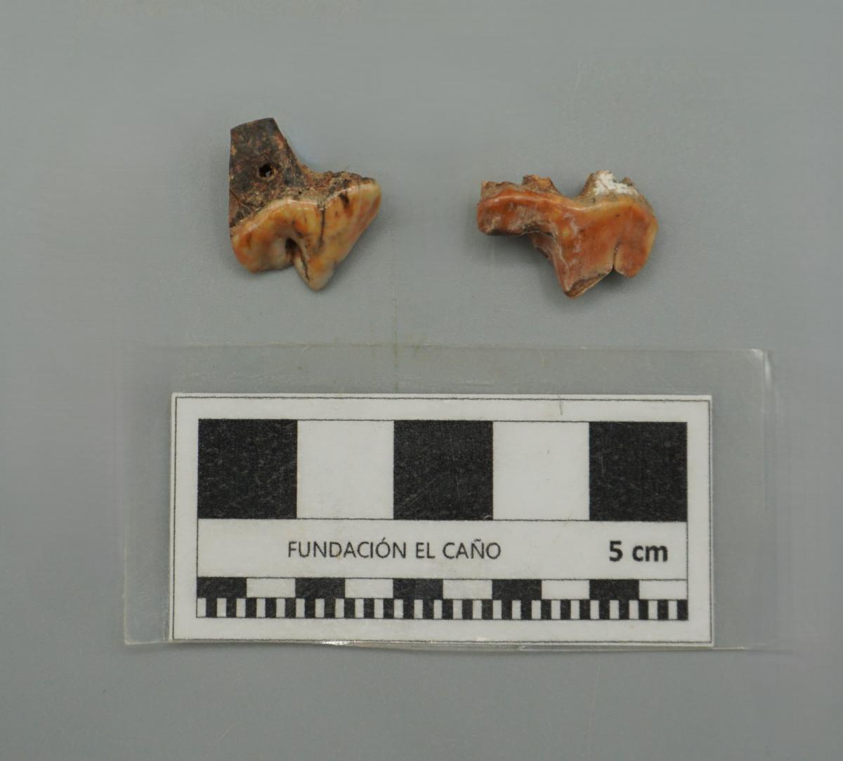 Dientes de perro fragmentados y perforados, el de la izquierda mantiene un tipo de perforación en la raíz, por donde sería pasada la cuerda para formar el collar y el de la derecha se encuentra fragmentado de la raíz pero también debió tener alguna perforación.