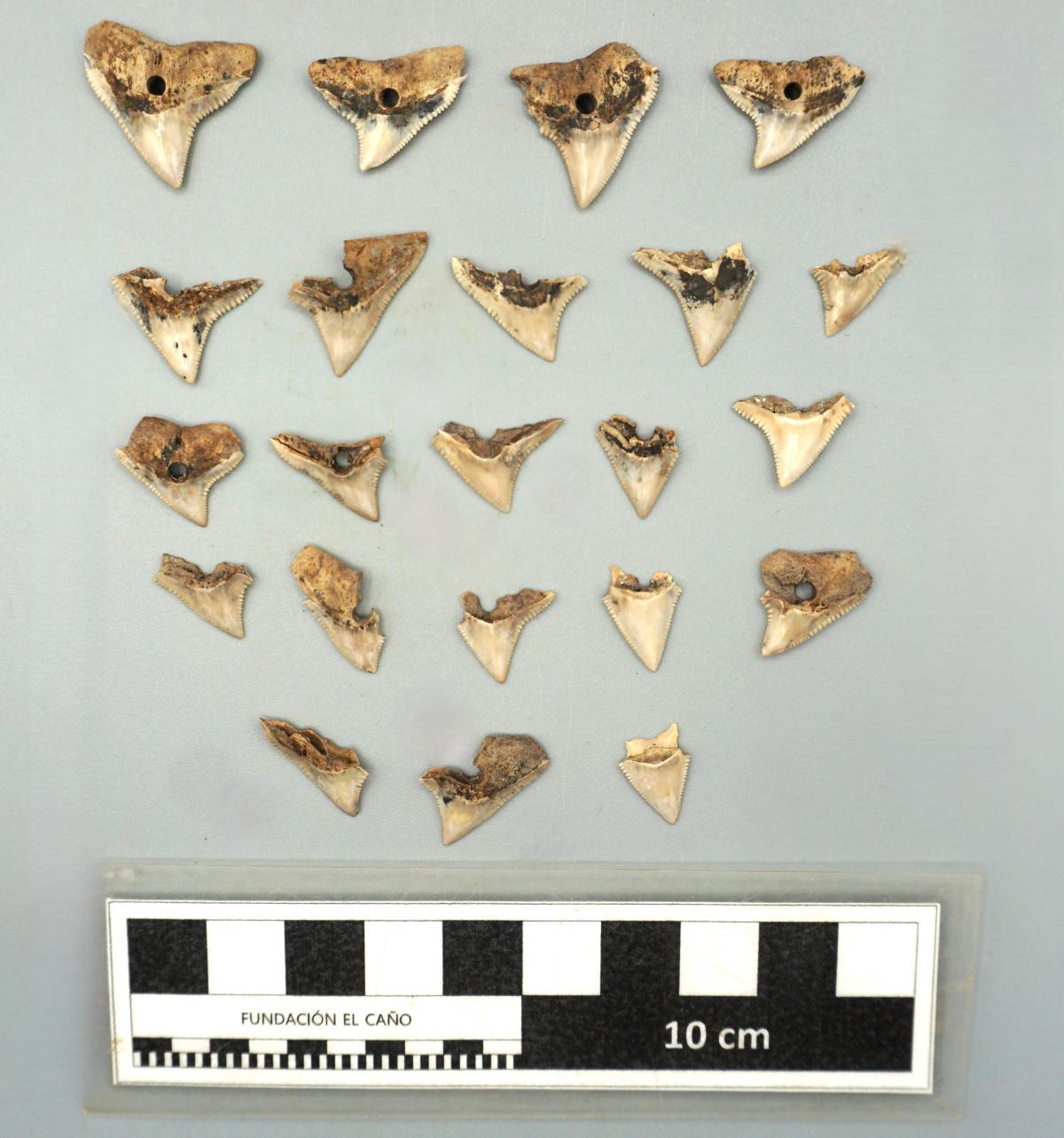 Conjunto de dientes de tiburón perforados y fragmentados. En la mayoría, se pueden apreciar las perforaciones hechas para pasar la cuerda durante la elaboración de pulseras y collares.