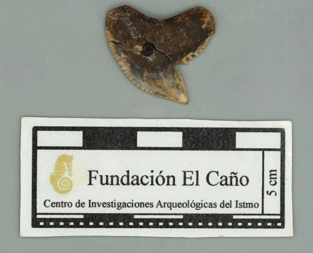3571 - Diente perforado de tiburón. La perforación indica que pudo haber formado parte de un artefacto ornamental.