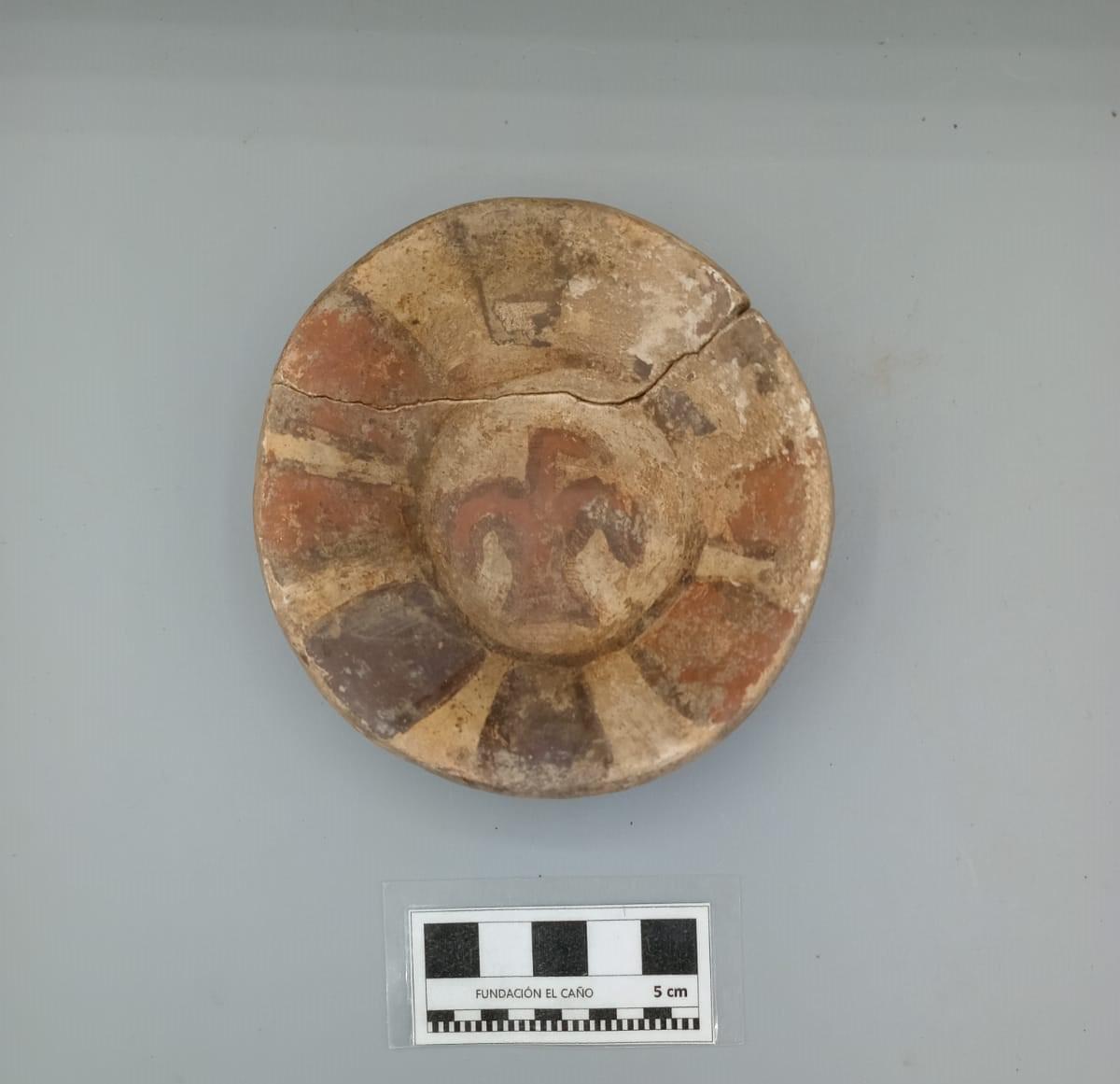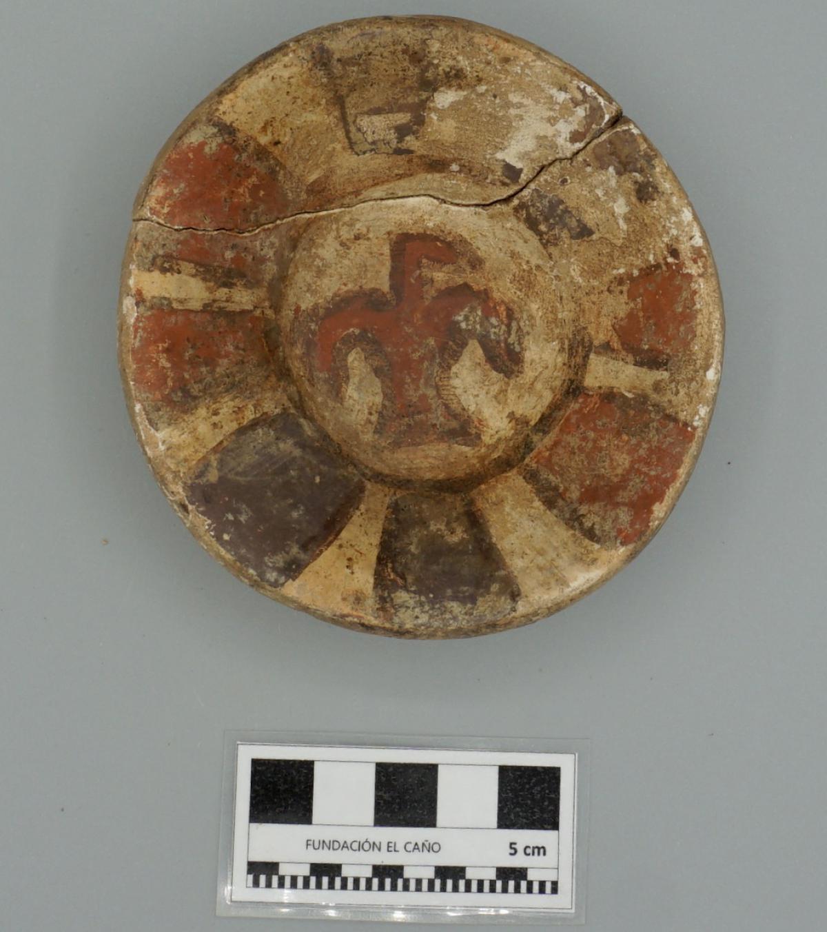 3655 - Cuenco policromo de base plana (sin soporte), con borde engrosado. Presenta engobe rojo en el exterior y blanco en el interior, con la representación de un cangrejo central y paneles geomé...