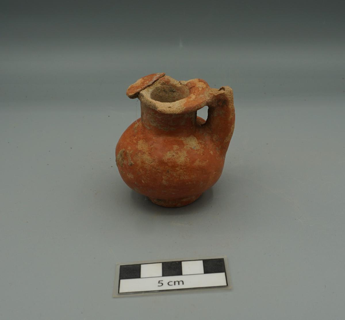 3659 - Jarra globular conte roja, con base anular, borde acanalado y vertedero adosado al labio.