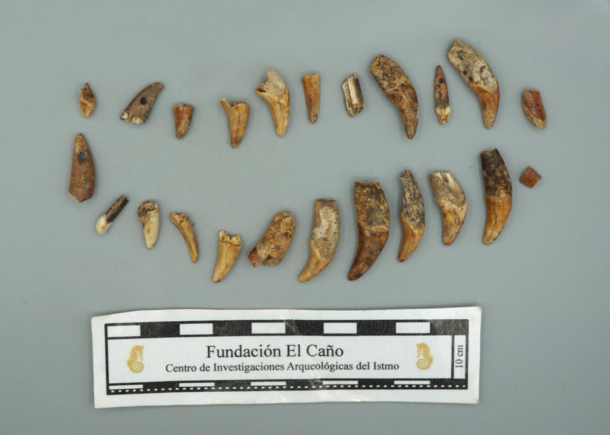 Conjunto de cuentas de dientes de perro, compuesto principalmente por caninos y tres incisivos, todos ellos con perforaciones.