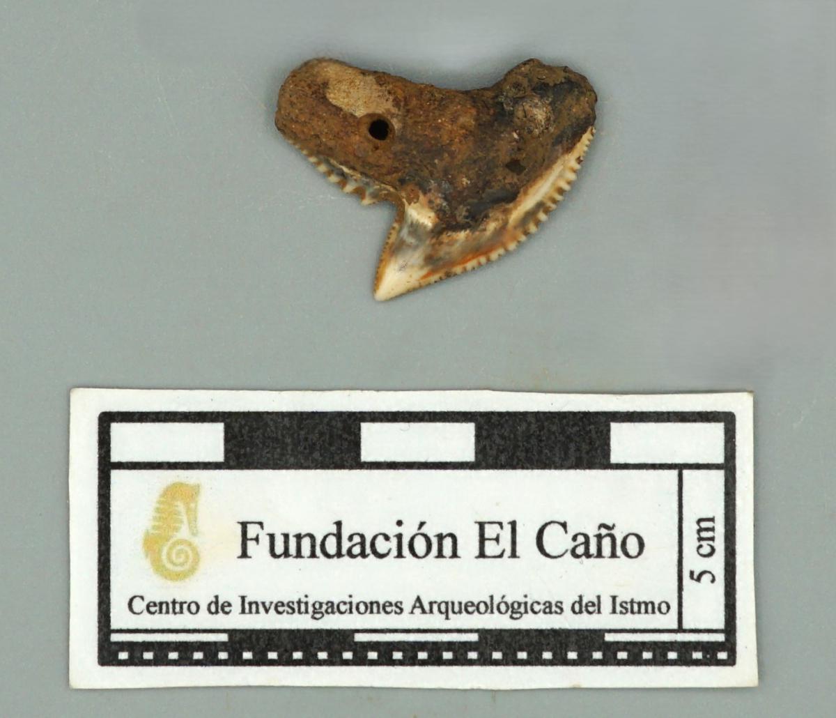 3571 - Diente perforado de tiburón. La perforación indica que pudo haber formado parte de un artefacto ornamental.