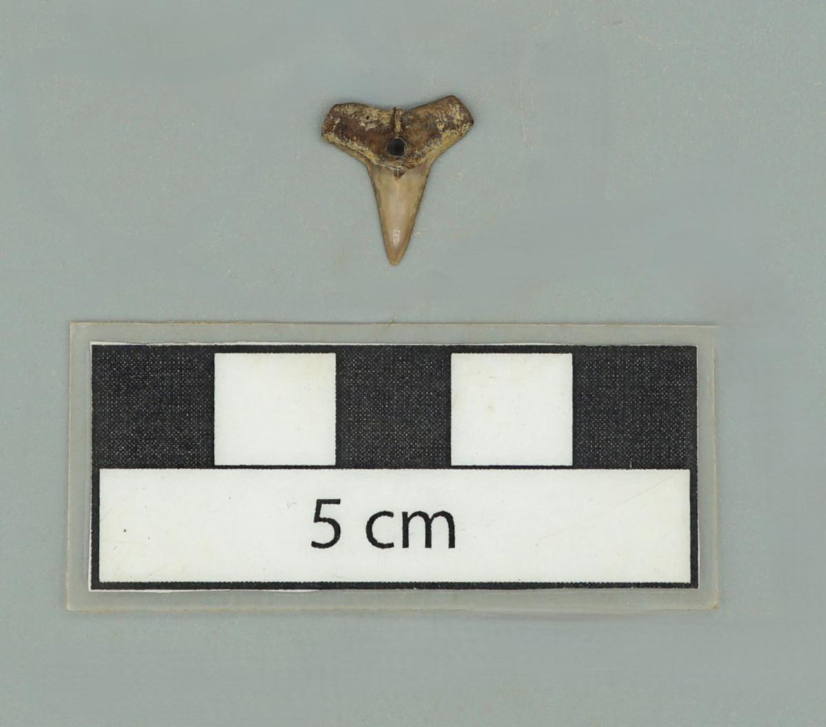 3571 - Diente perforado de tiburón. La perforación indica que pudo haber formado parte de un artefacto ornamental.
