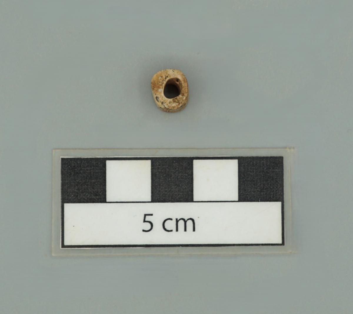 Vista de la perforación en la cuenta de ave. Es una perforación de estilo cilíndrica tubular que atraviesa el artefacto de extremo a extremo