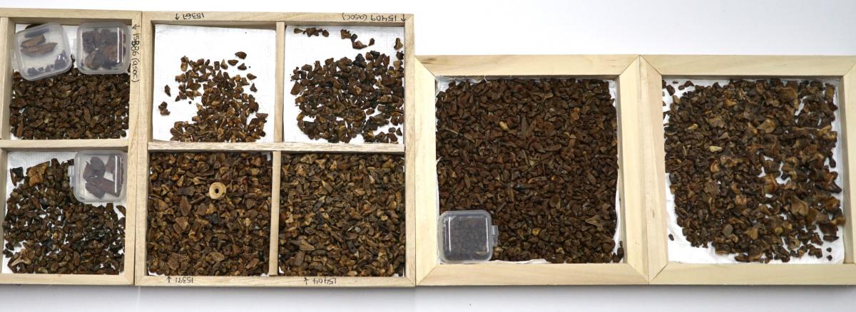371 - S-UE003. Combustión de una raíz. Depósito de características semejantes a UE002, de 0,03 m de espesor, localizado en los cuadros de excavación A4, A5, B4 y B5. Se recuperó carbón. Baj...