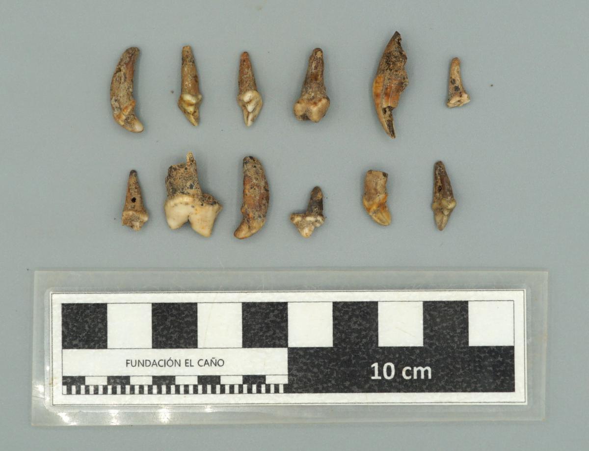 Se pueden observar dientes incisivos, caninos y premolares. También se resalta que algunos dientes han sido aparentemente cortados por la mitad.