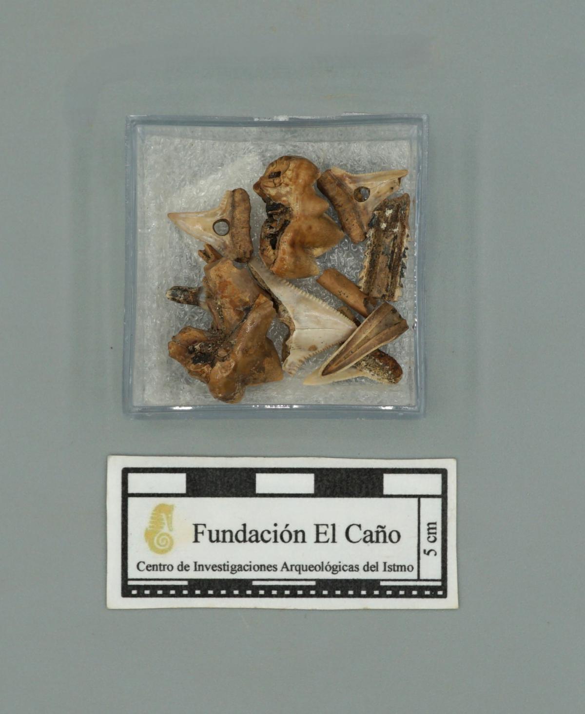 Está compuesto por fragmentos de la zona mesial de una espina caudal de raya, dientes de tiburón toro, caninos y premolares de perro y cuentas tubulares de hueso de ave.
