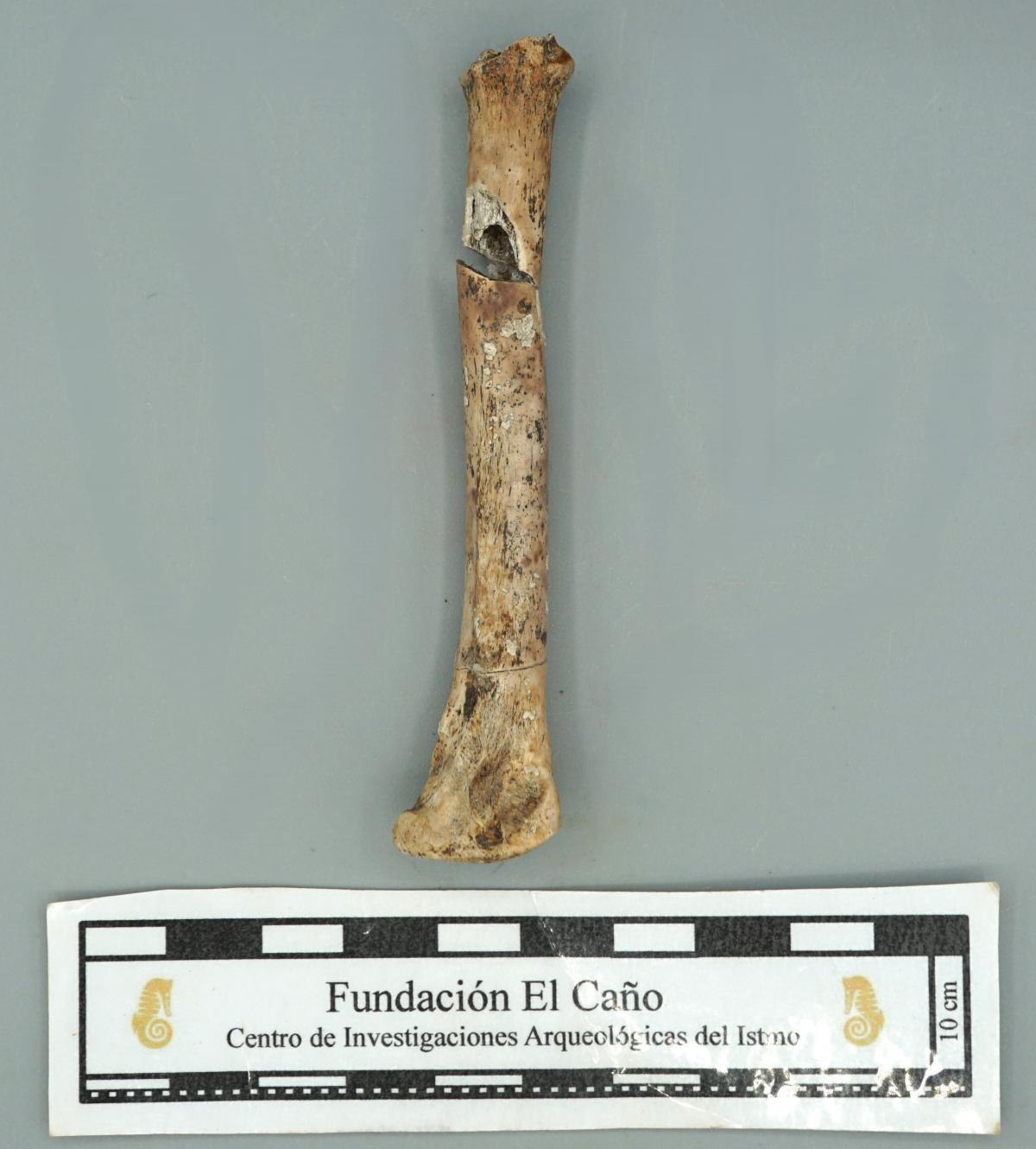 3606 - Hueso metapodiano trabajado de felino, parcialmente restaurado.