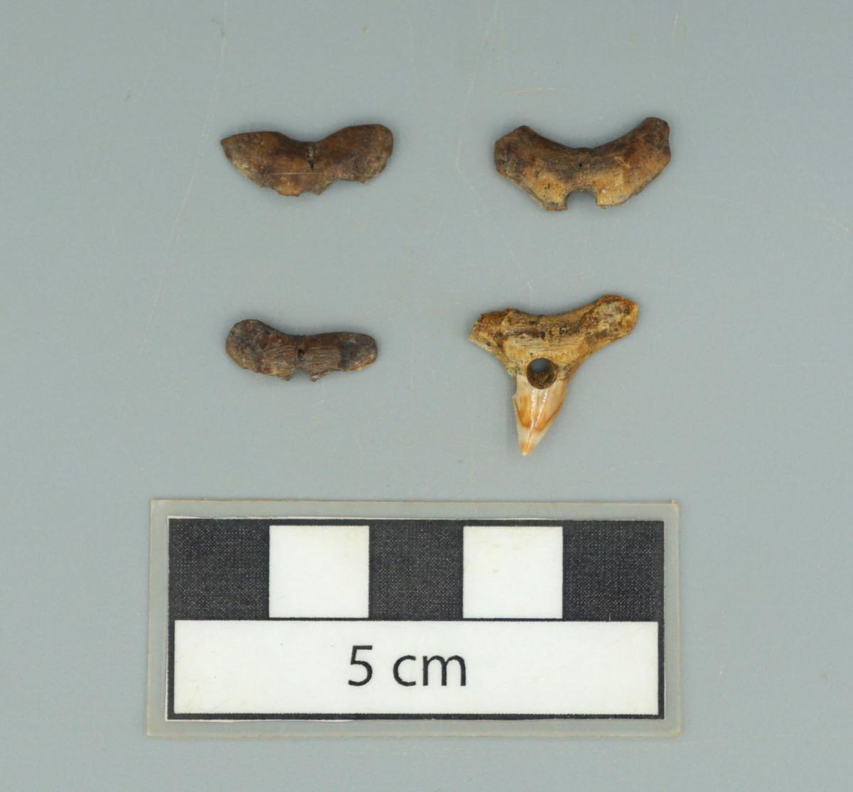 3571 - Diente perforado de tiburón. La perforación indica que pudo haber formado parte de un artefacto ornamental.