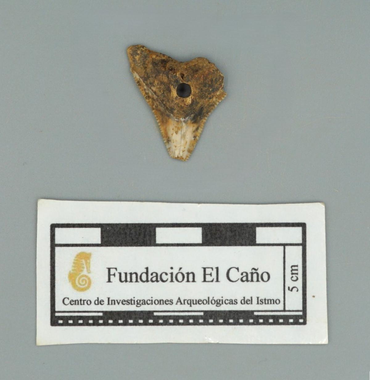 3570 - Diente perforado de tiburón. La perforación indica que pudo haber formado parte de un artefacto ornamental.