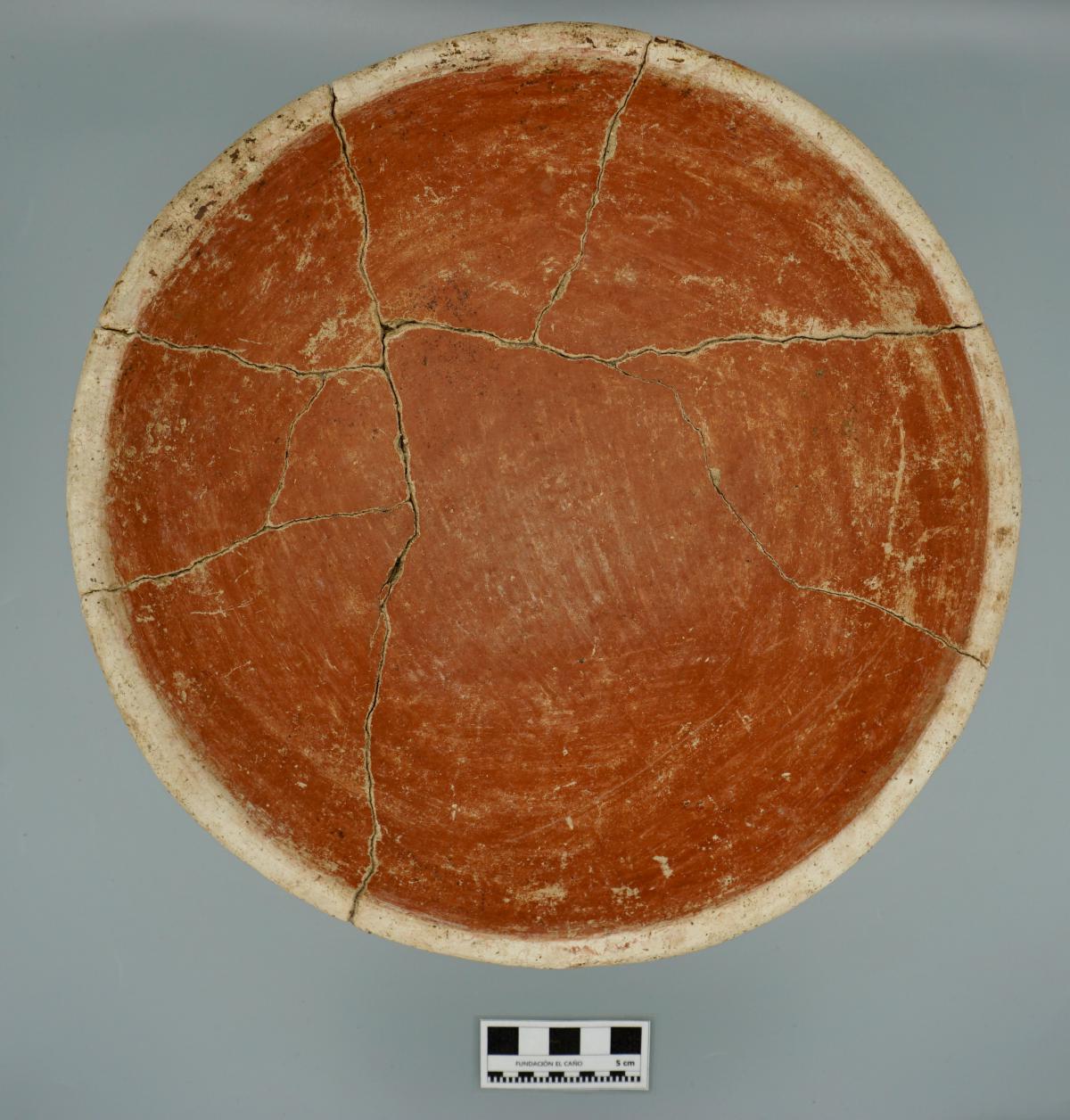 3658 - Cuenco de base plana, paredes ligeramente convexas y borde engrosado hacia el exterior, con engobe rojo externo y blanco interno, decorado con un panel central con la representación de un (...