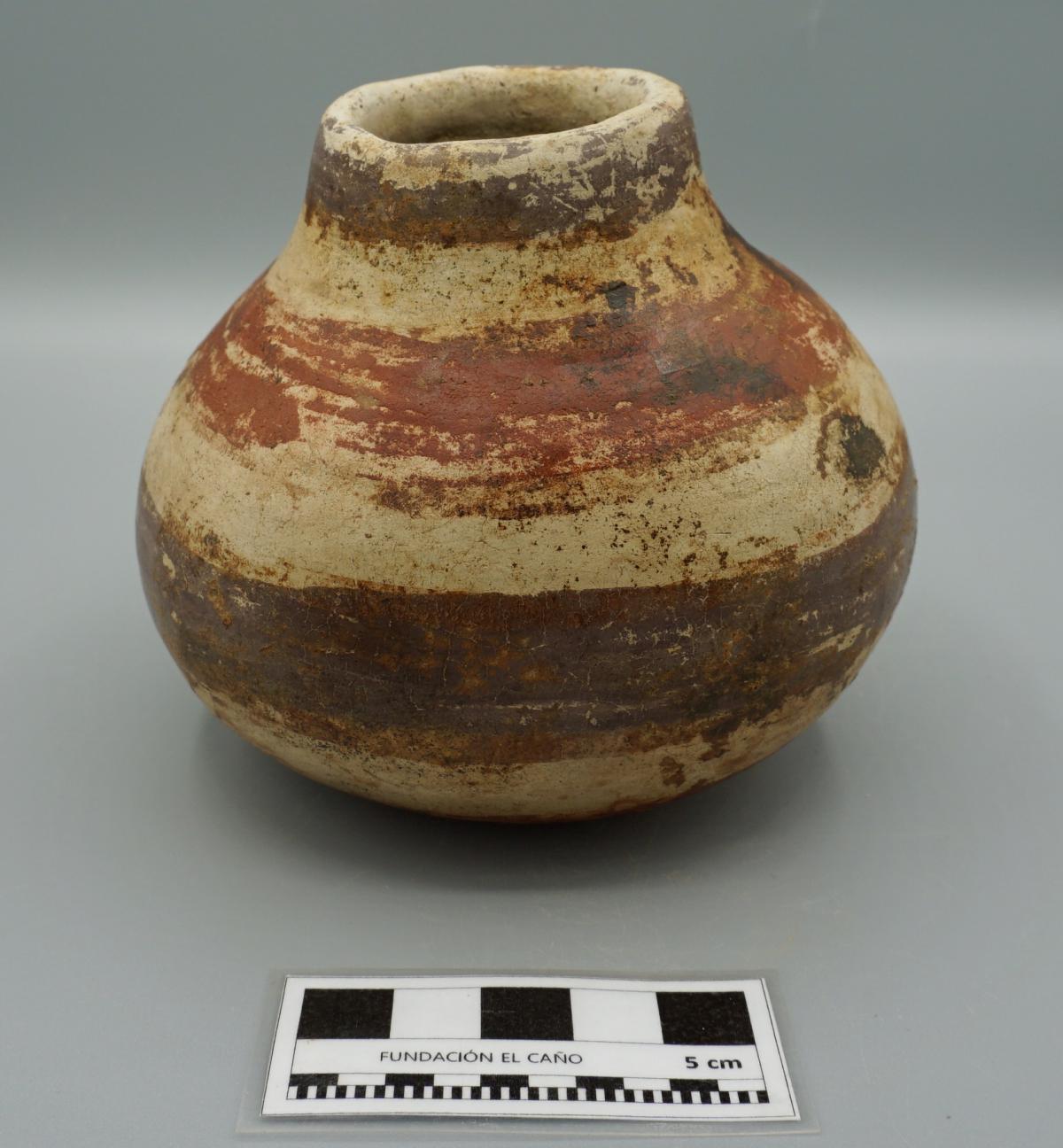 3559 - Jarra cilíndrica de cuello corto, del estilo Conte Policromo, decorada con líneas horizontales.