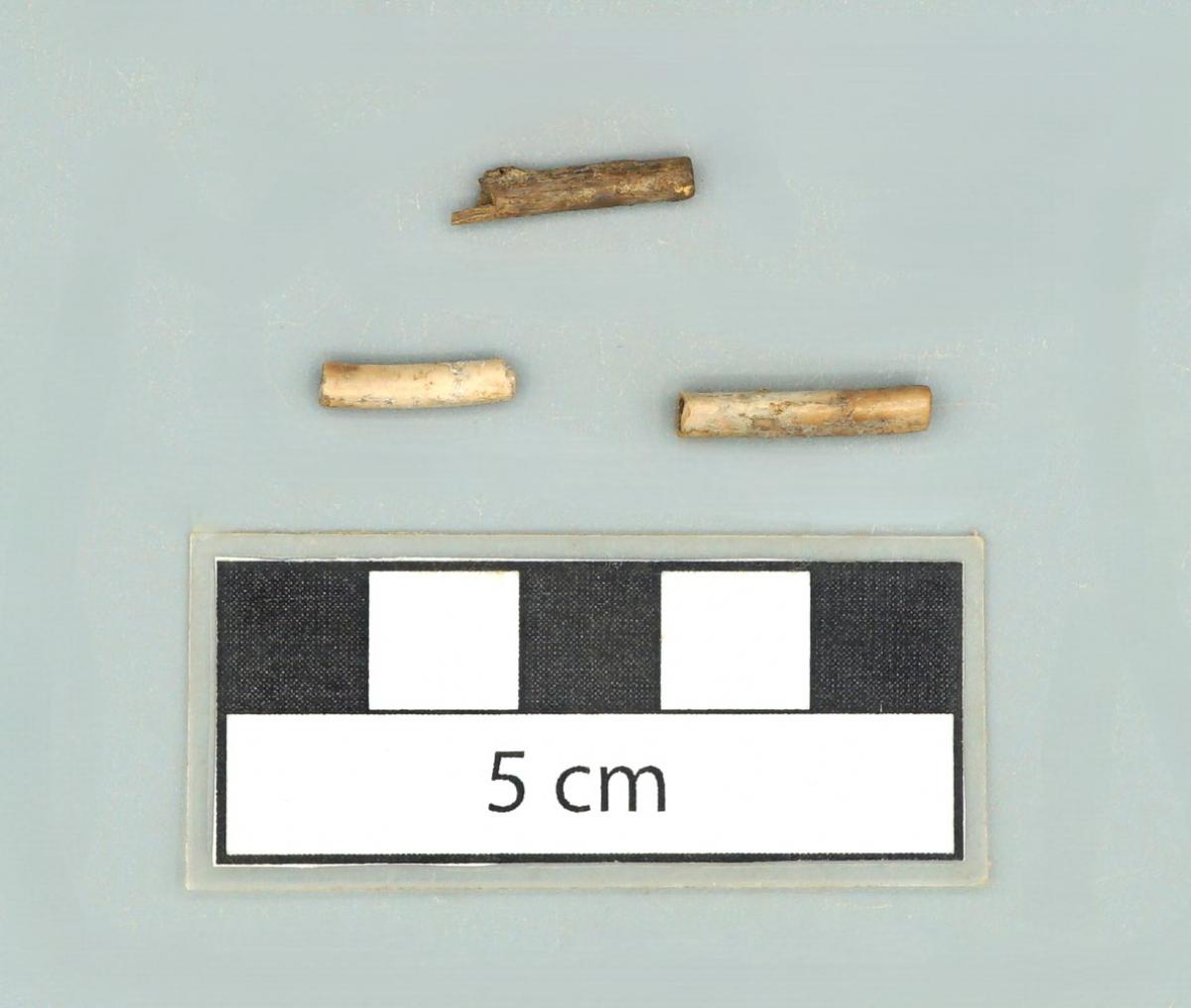3548 - Tubo de hueso de fauna. El artefacto se encuentra fragmentado y presenta un evidente pulimento en su superficie. Se infiere que originalmente se trató de un hueso largo, con un conducto que...