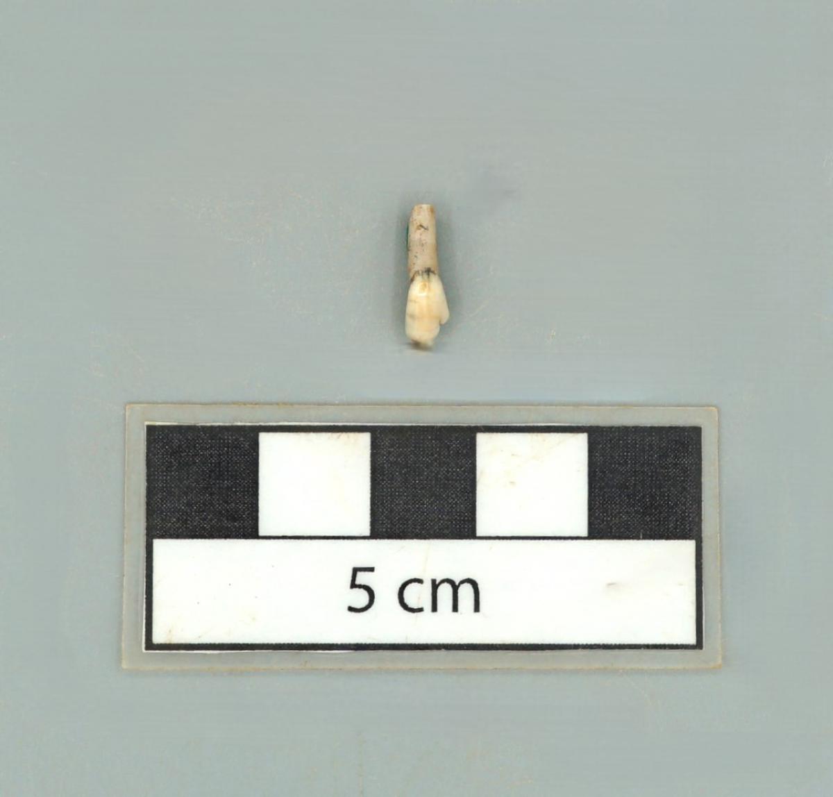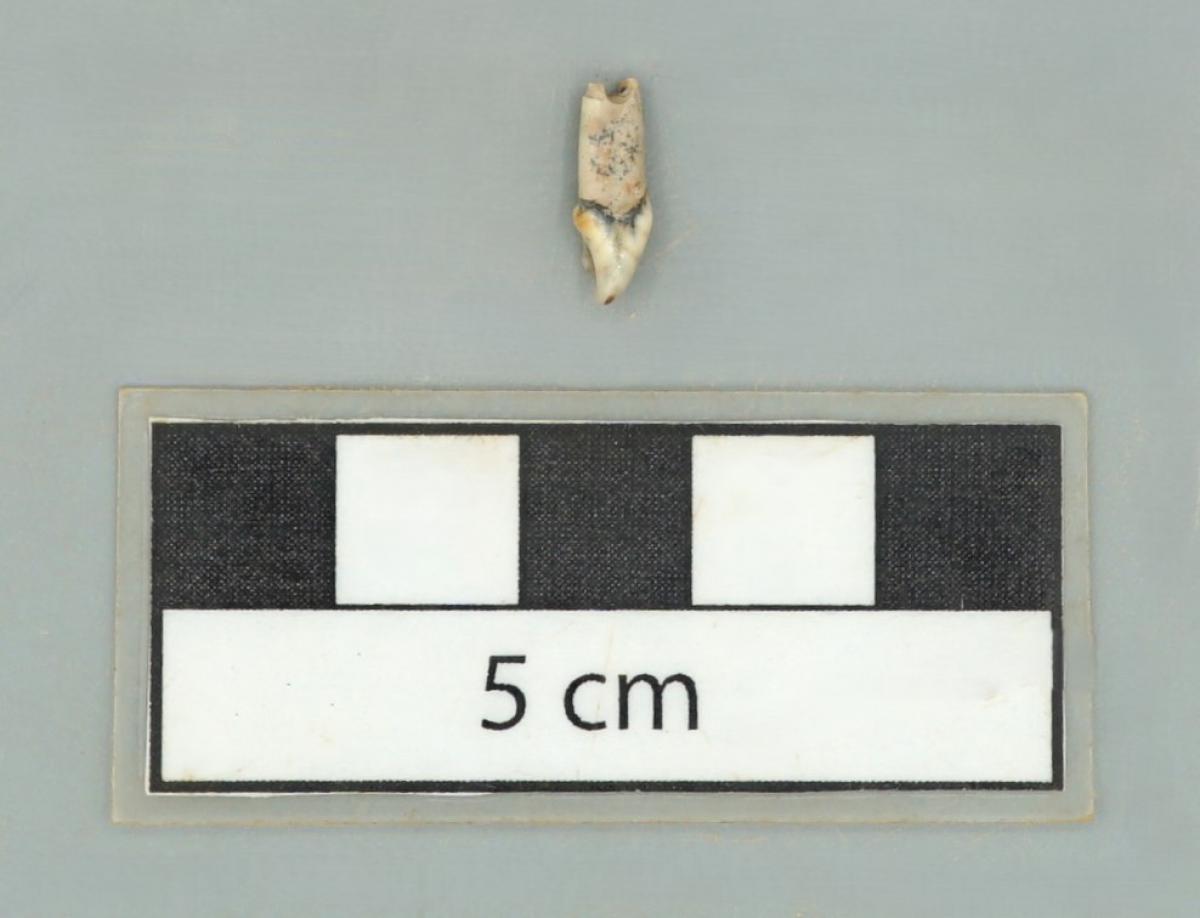 Vista lateral del tercer incisivo canino HF6939, en la que se observa una perforación. El diente presenta una fractura a la altura de la perforación.
