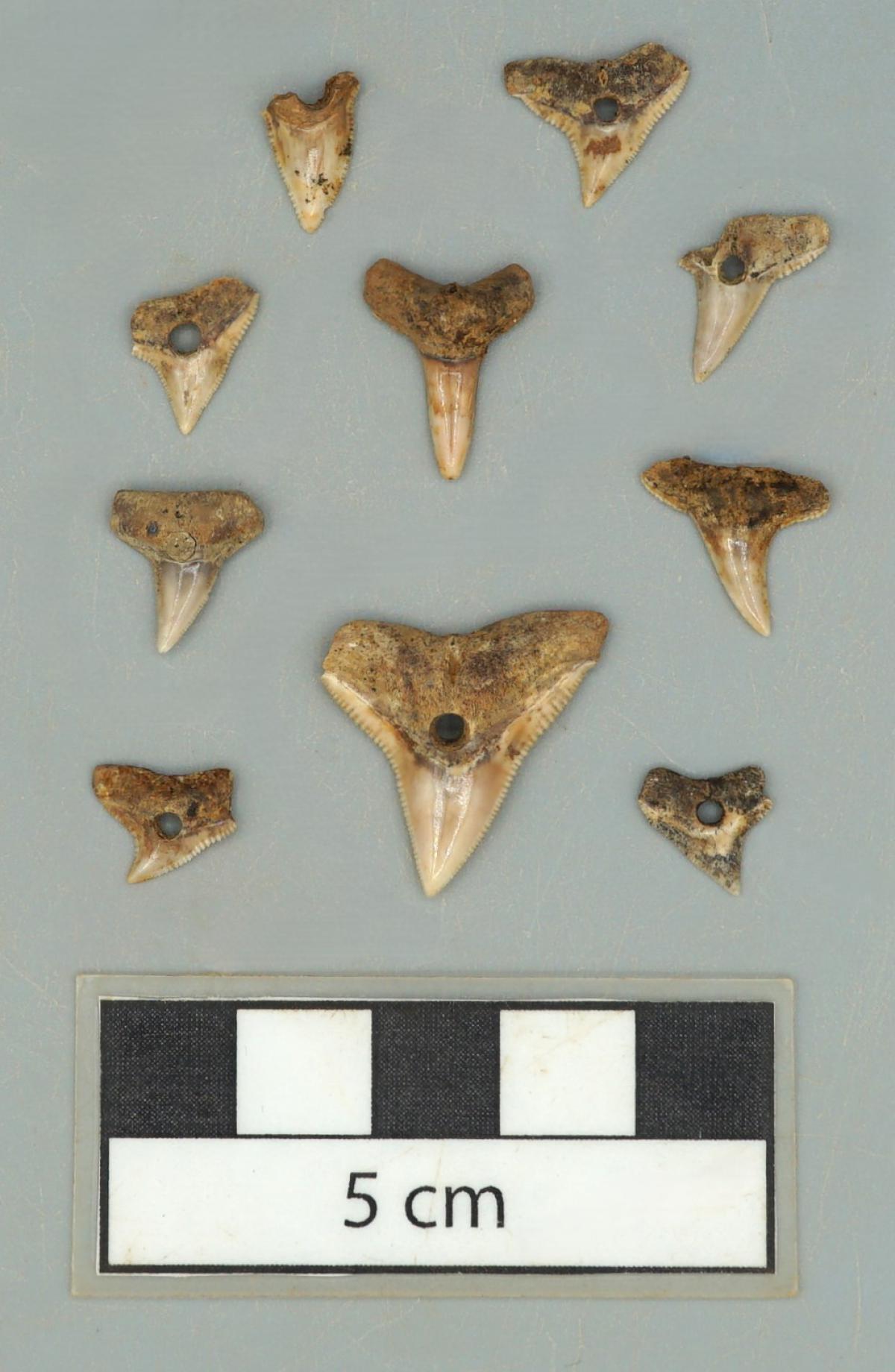 3571 - Diente perforado de tiburón. La perforación indica que pudo haber formado parte de un artefacto ornamental.