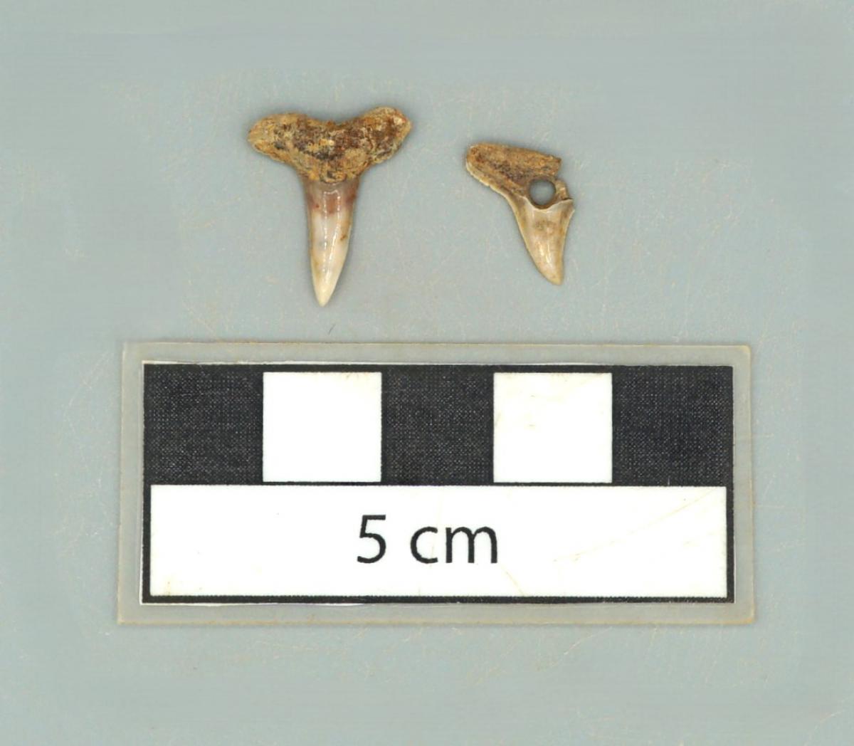 3571 - Diente perforado de tiburón. La perforación indica que pudo haber formado parte de un artefacto ornamental.