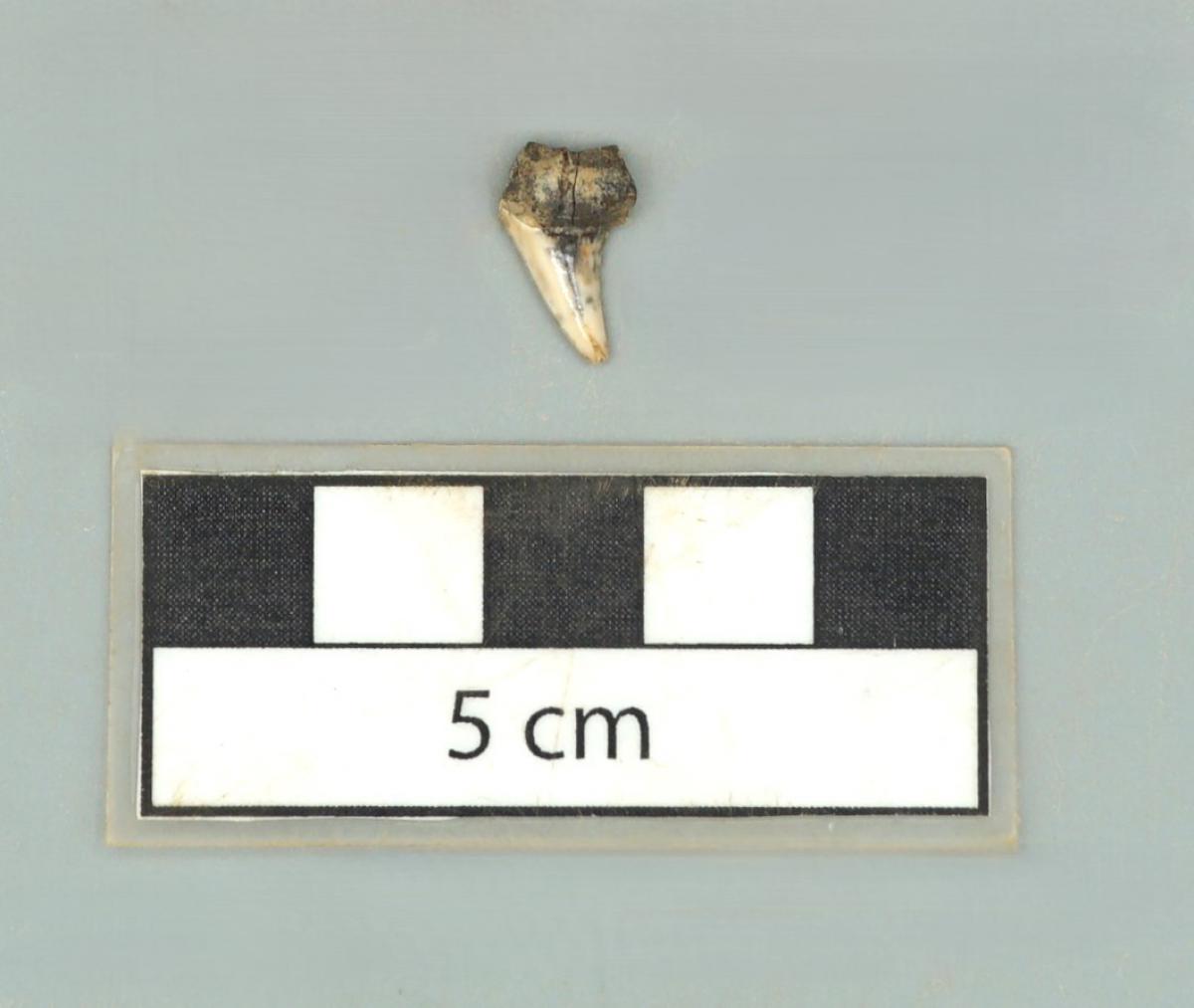 3571 - Diente perforado de tiburón. La perforación indica que pudo haber formado parte de un artefacto ornamental.
