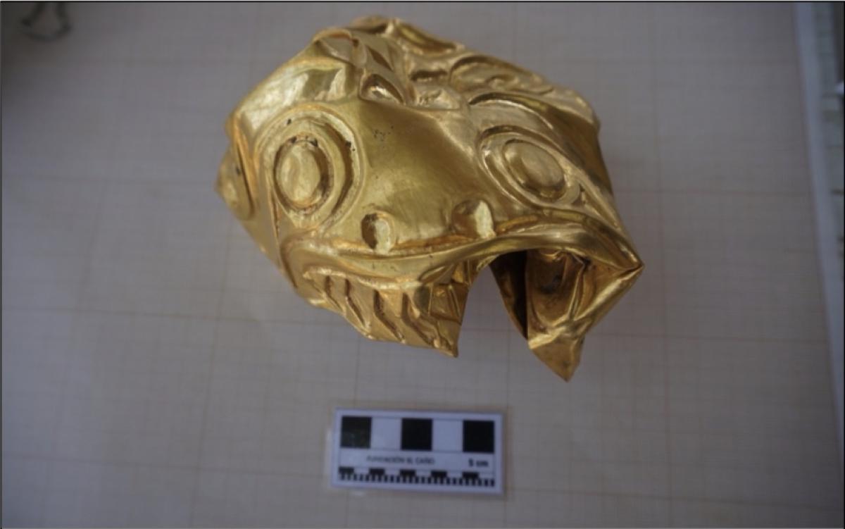 387 - Pectoral de oro martillado repujado con la representación frontal del rostro de un ser sobrenatural con rasgos de un anciano que formaba parte del ajuar del Individuo 20, un infante, de la ...
