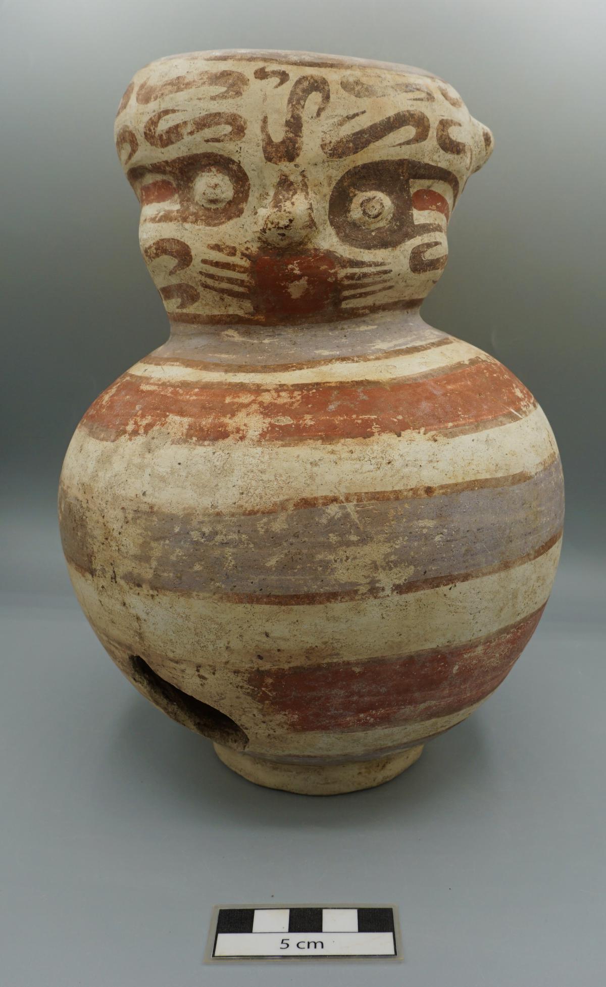 Efigie zoomorfa biglobular con base anular y una decoración de bandas rojas y moradas sobre el cuerpo, dispuestas de modo que resaltan el color blanco del engobe subyacente (forma de tigre).