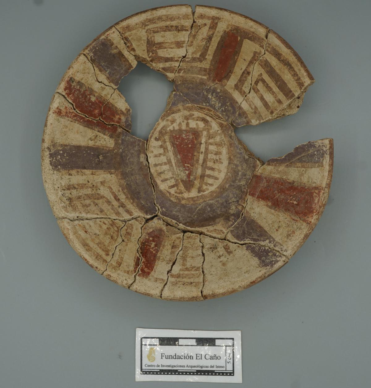 Cuenco con base anular. Presenta paredes ligeramente hemisféricas y borde engrosado. El borde se encuentra decorado en la zona central con una imagen que representa un crustáceo. Presenta engobe de color rojo en el exterior y blanco en el interior. El campo decorativo fue dividido mediante líneas rectas y curvas en color rojo y morado. En el interior fueron pintadas dos esvásticas con espirales.