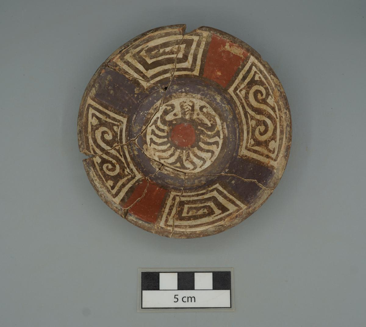 Cuenco de base plana, con paredes ligeramente convexas y borde redondeado. Presenta engobe rojo en el exterior y blanco en el interior, con decoración en rojo y morado. En el panel central se representa un crustáceo, mientras que en las paredes internas se pintaron cuatro esvásticas con espirales dobles divergentes y garras.