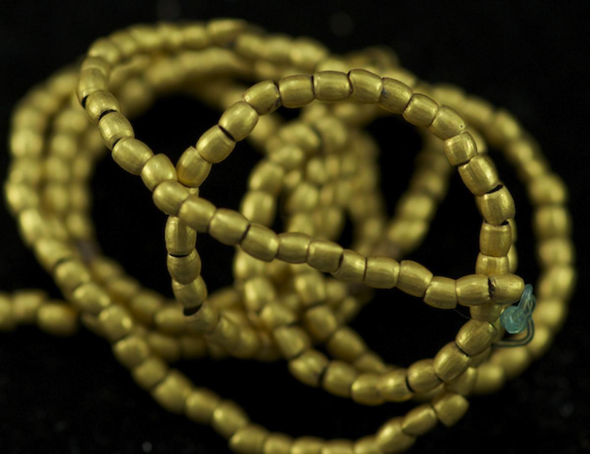 Información del recurso:  Conjunto de cuentas barril de oro que fueron encontradas junto con otros objetos dentro de un paquete que acompañaba al individuo I7 de la unidad UE134 de la Tumba T2.