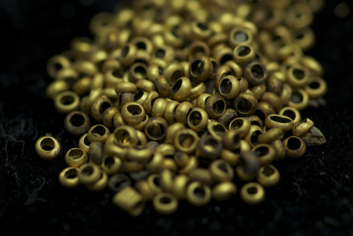 454 - Pulsera compuesta por 39 cascabeles de oro fundido que tienen un espesor alrededor de 2 mm oscilando sus tamaños entre 9 y 13 mm de diámetro y 11 a 16 mm de largo. El objeto formaba parte ...