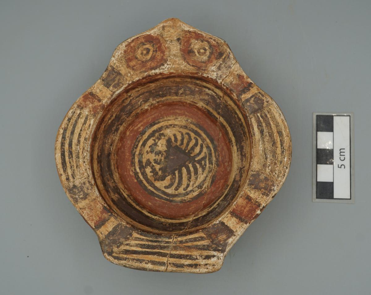 Efigie zoomorfa en forma de cuenco de base plana representando a un ave. Engobe rojo en el exterior y blanco en el interior. Los bordes del cuenco se desplazan lateralmente y una vez pintados sugieren la cabeza, alas y cola del ave. En las paredes internas del cuenco pintaron bandas alternas de color rojo y morado, y en el panel central un cangrejo.