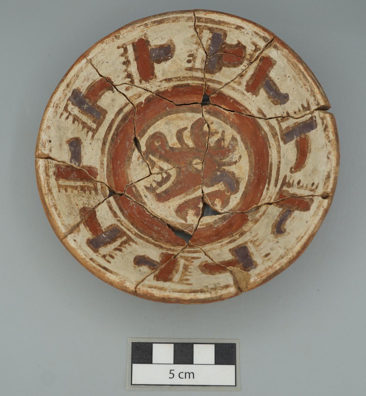 Cuenco de base plana circular, ligeramente convexo y borde apuntado en el interior. Engobe exterior rojo y blanco en el interior de la vasija. Motivo central zoomorfo (venado) y patrones de huellas sobre las paredes del cuenco.