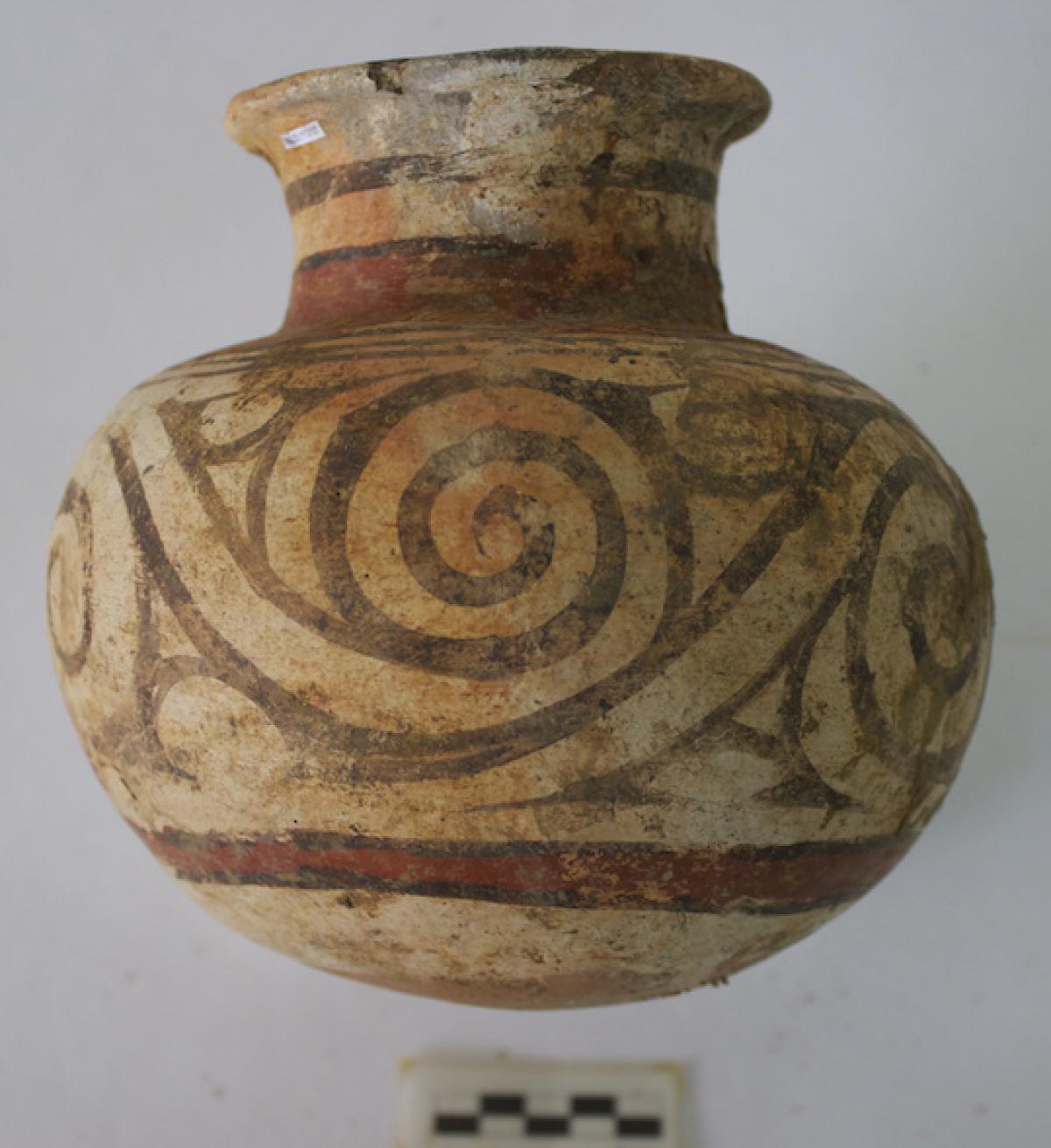 3639 - Jarra policroma globular de cuello largo. Presenta una decoración geométrica de espiral continua tipo “YC” a modo de friso en el cuello, y bandas alternas en zigzag sobre el cuerpo.