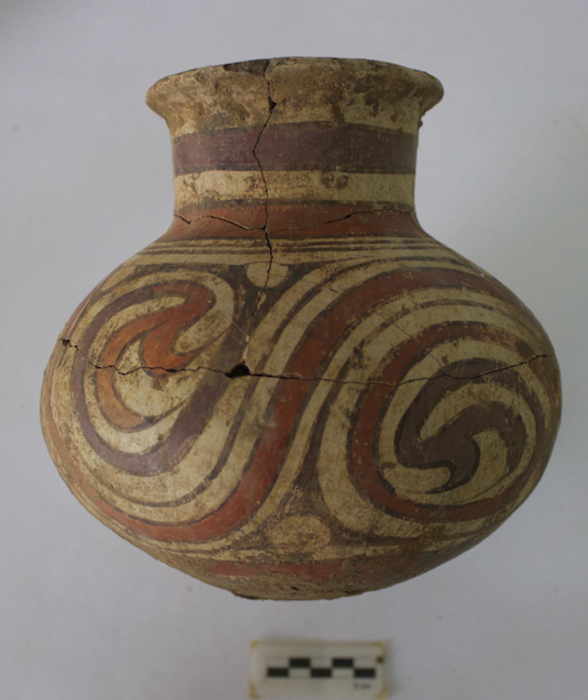 3639 - Jarra policroma globular de cuello largo. Presenta una decoración geométrica de espiral continua tipo “YC” a modo de friso en el cuello, y bandas alternas en zigzag sobre el cuerpo.