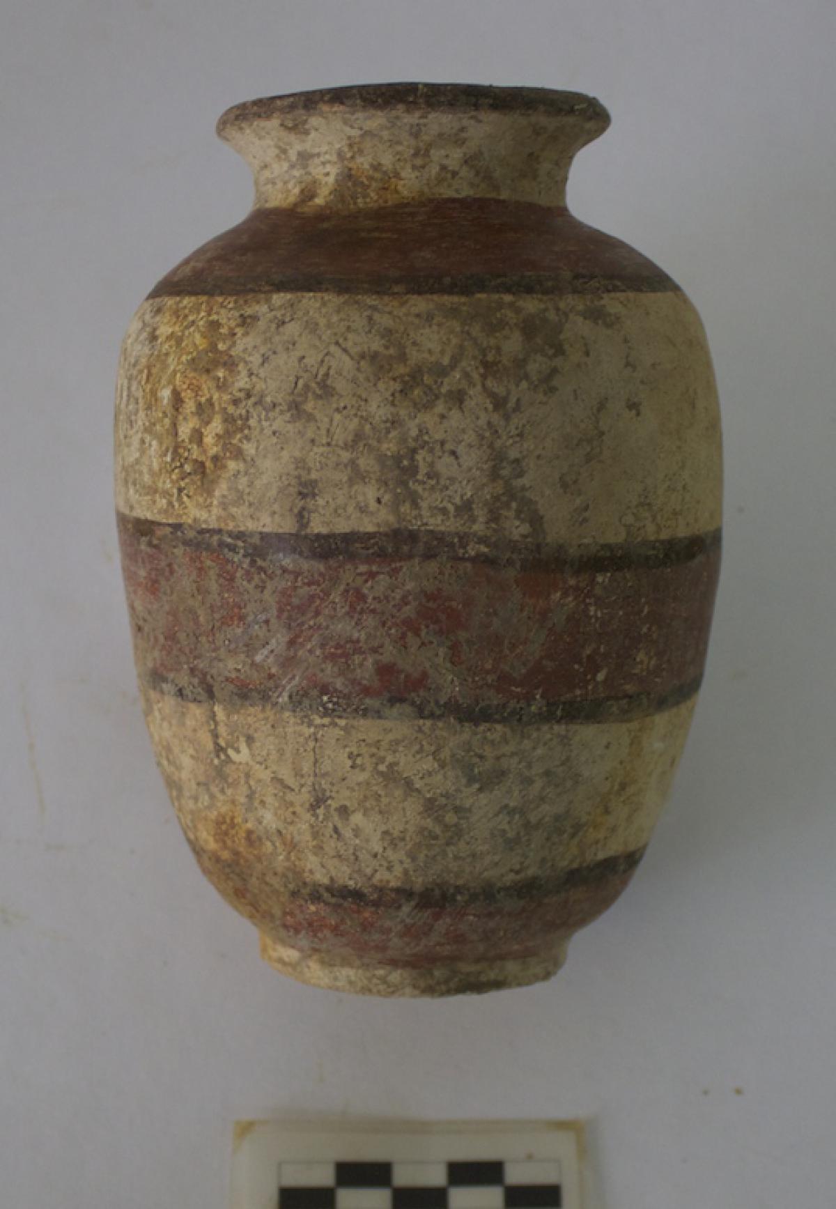 3559 - Jarra cilíndrica de cuello corto, del estilo Conte Policromo, decorada con líneas horizontales.