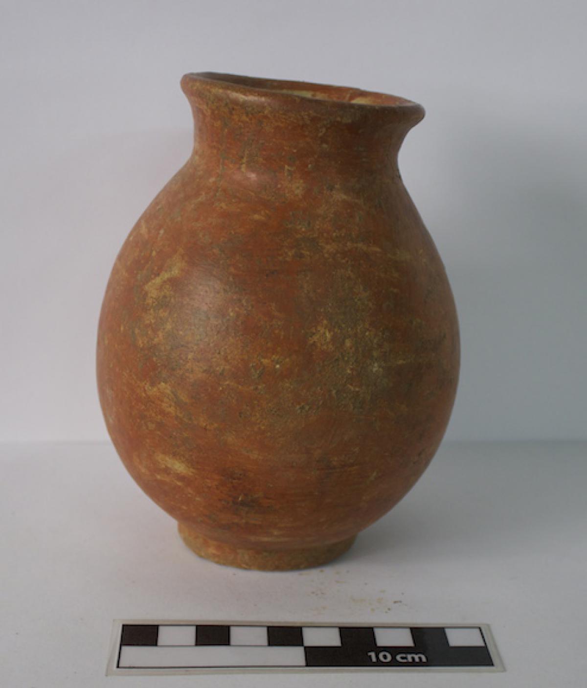3566 - Jarra globular de base anular, cuello corto y borde plano. Engobe rojo en la superficie exterior.